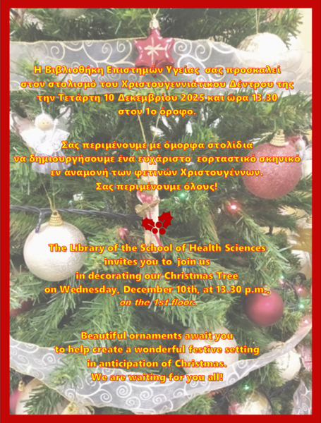 Η Βιβλιοθήκη Επιστημών Υγείας σας προσκαλεί στον στολισμό του Χριστουγεννιάτικου Δέντρου της, την Τετάρτη 10 Δεκεμβρίου 2025 και ώρα 13.30πμ στον 1ο όροφο.