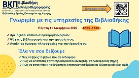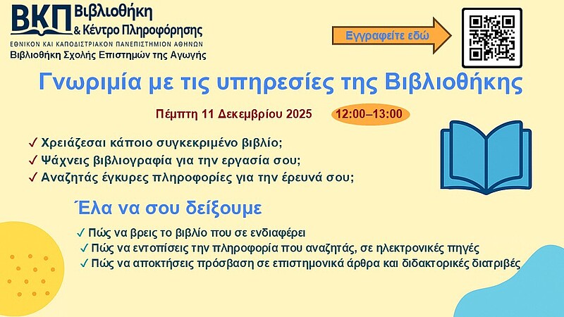 Το σεμινάριο «Γνωριμία με τις υπηρεσίες της Βιβλιοθήκης» θα πραγματοποιηθεί την Πέμπτη 11 Δεκεμβρίου 2025 και ώρα 12:00 - 13:00, στη Βιβλιοθήκη της Σχολής Επιστημών Αγωγής επί της οδού Δραγατσανίου 4 (εντός της στοάς, 2ος όροφος), Πλατεία Κλαυθμώνος, Αθήνα.